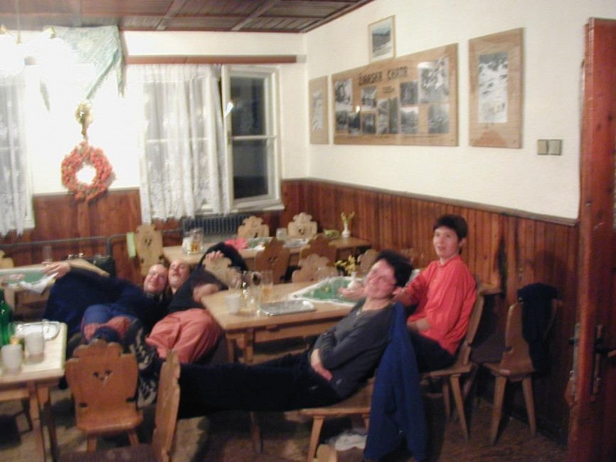 V úterý jsme vzhledem k počasí, které od rána slibovalo pouze déšť, nebyli příliš rozhodnuti, co budeme dělat, posléze, když slunce vylezlo, jsme se rozdělili na dvě skupiny. Jedna šla na lyžích do Smutného sedla, druhá pěšky k blízkým vodopádům v úpatí Baníkova. Detaily první skupiny neznám, vím jen, že Káča trhla Honzu Š. ve výstupu do sedla. Celá skupina se poté vrátila na chatu, my jsme s Karlem a Zdenou po lezecké vložce na skále, kde vodopády tečou, absolvovali krásný ale dlouhý výstup na Príslop Baníkova, odkud jsme po sousedním hřebeni seběhli zpět do doliny k chatě. Cestou jsme navštívili pomník těm, kdo v souboji s horou nevyhráli. Je tam nápis, který říká: Mrtvým na památku, živým pro výstrahu...