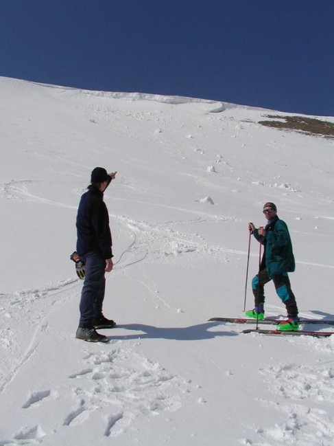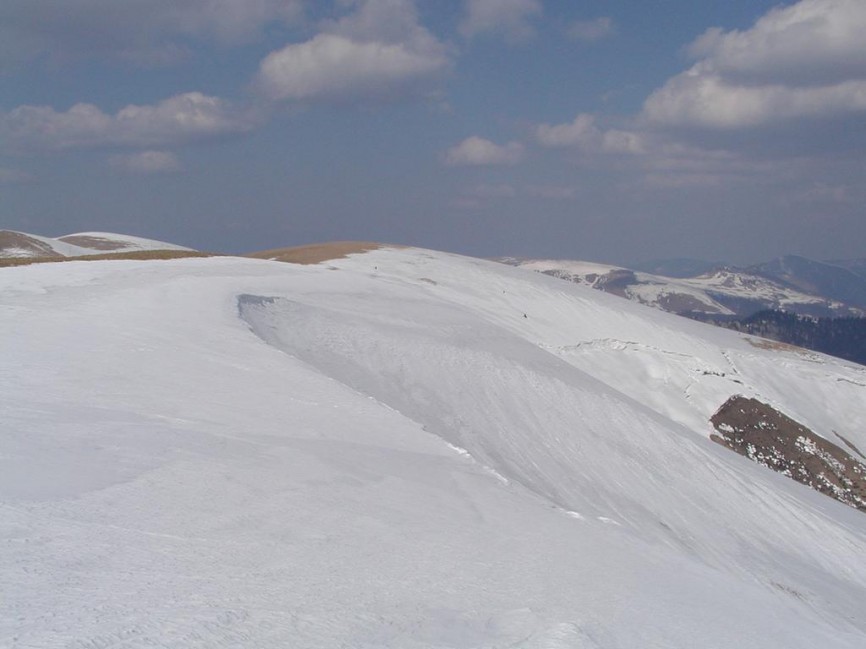 Nikde ani obláček, sluníčko svítilo, sníh jiskřil a křupal pod lyžemi. Jenomže já trouba si někde večer zahrabal své sqwěllé protisluncové brýle a mžoural celý den. Vyběhli jsme na Suchý, nechali tam batoh a sjeli Suchý. Pokus o skok převěje: já pád, Michal OK, Tomáš pád. Já a Tomáš druhý pokus - já opět pád Tomáš OK. Pak už mě nebavilo dělat šaška a šli jsme zase nahoru k batohům. Udělali jsme ještě dva nádherný sjezdy a vymysleli, že z hřebene nesjedeme do Turecké, jako Honza, ale že to zkusíme do Vyšných Revúc žlebem Križnej. Sjeli jsme hodně hluboko do údolí a udělali posledních pár fotek lavin. Dále cesta vedla podél potoka, kterou často křižovala. Když se interval souvislé sněhové pokrývky - tudíž i efektivní jízdy - začal zkracovat a naopak frekvence sundavání a nandavání lyží zhušťovat, rozhodli jsme se přezout, umýt a převléct. Tomáš si ještě nechtěl zouvat přeskáče, ale pak podlehl většině a taky se přezul. Došli jsme akorát za zatáčku a začali jsme se brodit v teniskách asi kilometr měkkým sněhem.