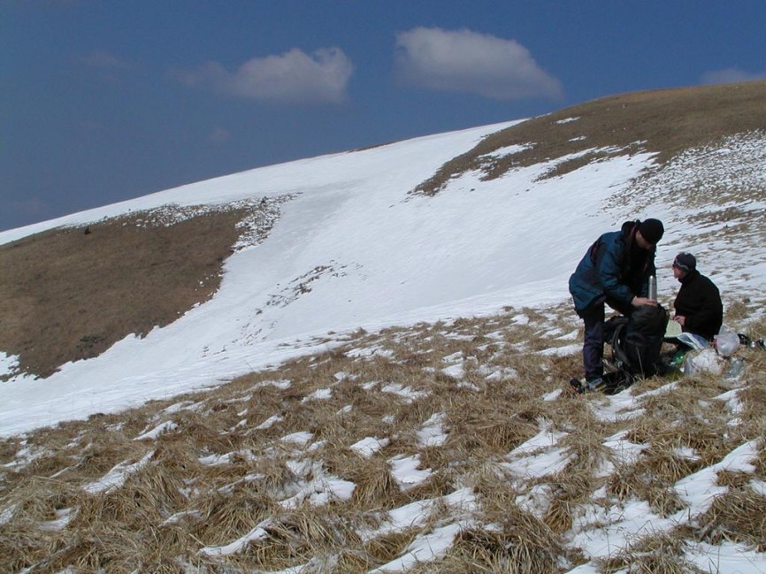 Sice to bylo pěkně do kopce, ale aspoň s lyžemi na nohách a ne na baťohu. Pak jsme objevili pěkný svah a dali si první sjezdík pěkně nalehko - bez batohů. Na horu je to rychlejší s lyžemi na nohách (Honza to může potvrdit). Po třetí hodině jsme dojeli na Smrekovicu - bývalý vojenský rekreační areál.